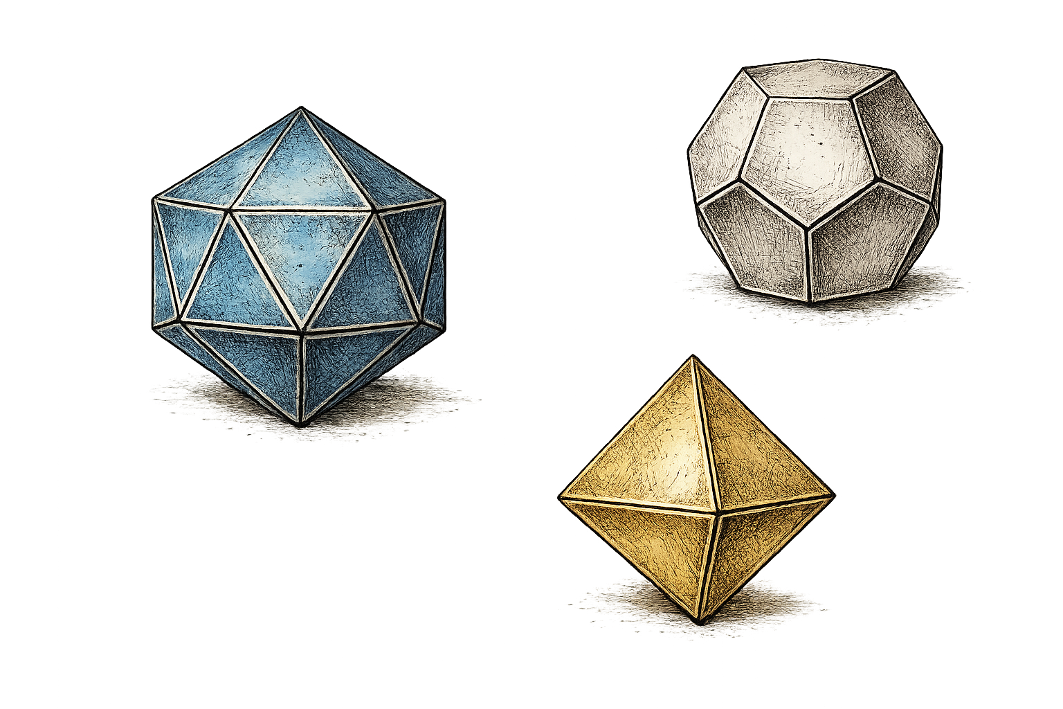 Nos apoyamos en algunos sólidos platónicos para simbolizar los elementos del viento, el agua y las estrellas